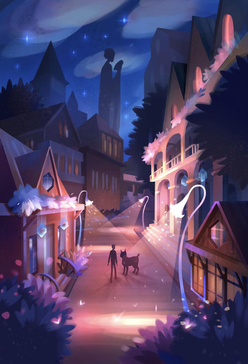 Снизу доносился плеск воды, бьющейся о каменные стены. Тимур перегнулся через перила — широкая тёмная река неспешно текла вдаль. Пройдя над арками мраморного моста, друзья оказались на длинной улице, которую освещали причудливые перламутровые фонари в виде лилий. Вокруг полураскрытых, чуть мерцающих бутонов роились зелёные светлячки. Тимур остановился рядом с фонарём: ему показалось, будто тот свернул лепестки и снова раскрылся.