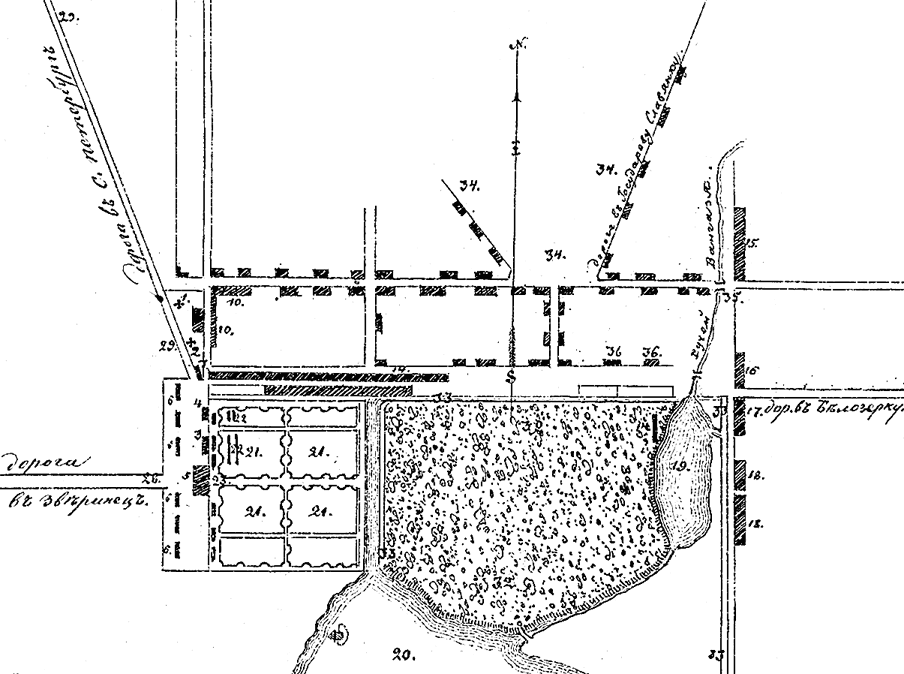 4. Называемая Знаменская между Средней улицы и Церковной ограды, сия площадь, бывшая до сих пор употребляема к ярмонки и прочих торгов, также помещение карет прибывающих ко дворцу и прочаго, сия площадь по местному положению и обычаю, по мнению моему, ныне больше способна к торгу, покуда Город будет выстроен, и тогда Соборная площадь будет более способна к торгам»[16].