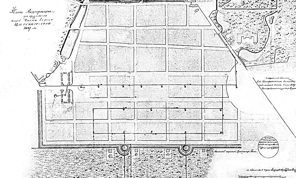 Через обе городские площади по продольной оси прошла магистраль городского водопровода с водоразборными бассейнами из гранита. Городской водопровод был важным новшеством автора городского плана. «План водопроводов для продовольствия новой части города Царского Села», разработанный Гесте, император утвердил 6 ноября 1809 г.[18]. Проект Гесте в первую очередь предусматривал водоснабжение новых кварталов между Московской улицей и Кузьминским (Нижним) бульваром. Проточной таицкой водой наполнялись бассейны в Школьно-садовом заведении и на бульваре. Для этого использовалась таицкая вода, самотеком поступающая по городу из Кухонного пруда в Александровском парке. Магистраль от выпуска в плотине провели к усадьбе Кваренги, где она пересекала Дворцовую улицу в подземной трубе диаметром 2,5 дюйма и далее направлялась в сторону Кузьминских ворот. Соответственно числу кварталов от нее соорудили три ответвления. Их проложили по городу параллельно, по границам смежных домовладений. Водоразборные бассейны размещались в центре каждого квартала на прямоугольных площадках, где соприкасались все расположенные здесь участки. Верхняя ветка доставляла воду в Дворцовый госпиталь и соединялась с Павловским водоводом. Трубы от нижней ветки проходили на бульвар, его бассейны имели выпуски на городской выгон. Первые деревянные трубы времен Гесте впоследствии заменили керамическими, а затем чугунными. Водоснабжение высоко расположенной части города между Садовой и Малой улицами смогли организовать только в 1887 г. после сооружения водонапорных Орловской и Певческой башен.