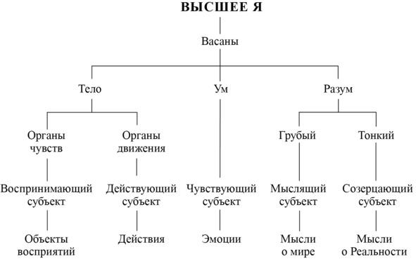 Каждый человек состоит из Духа и материи. Дух — это Высшее Я, божественная сущность личности. Материя — это ее тело, ум и разум. Высшее Я оживляет материю, наделяя тело способностью воспринимать и действовать, ум — испытывать эмоции, а разум — мыслить, созерцать. Однако характер восприятий и действий, эмоций и мыслей, присущих телу, уму и разуму, зависит от врожденной природы человека, именуемой васаны. Каковы васаны человека, таковы его мысли, чувства, восприятия и действия.