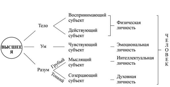 Итак, человек — это совокупность воспринимающего, действующего, чувствующего, мыслящего и созерцающего субъектов. Синтез физической, эмоциональной, интеллектуальной и духовной личностей, как показано на схеме ниже.