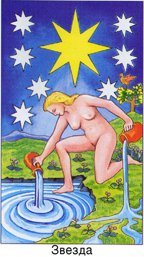 Здесь я не совсем согласен, так так есть некий намек на XIV Аркан. Нас учили, что сосуды абсолютно одинаковые. Мы дальше будем о них говорить, сосуды здесь обозначают тела, в которые входят души. И я бы нарисовал по-другому: одним сосудом она зачерпнула, а вторым выливает, то есть не одновременно выливает.