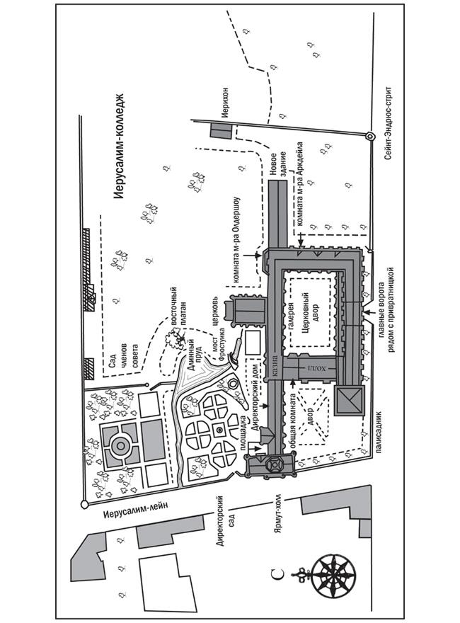 Колледж занимал восемь или девять акров земли. С трех сторон его окружала высокая кирпичная стена на средневековом фундаменте из бутового и тесаного камня, с четвертой — основные здания. Стены были увенчаны рядами шипов. Длинный пруд позади часовни изгибался к юго-востоку. Его питал ручей, который монахи много лет назад пропустили под стенами, задолго до того, как возникла сама мысль о Иерусалим-колледже. На дальней стороне пруда были разбиты Сад членов совета и Директорский сад. Бо́льшая часть города располагалась на некотором отдалении от беспорядочного нагромождения зданий колледжа.