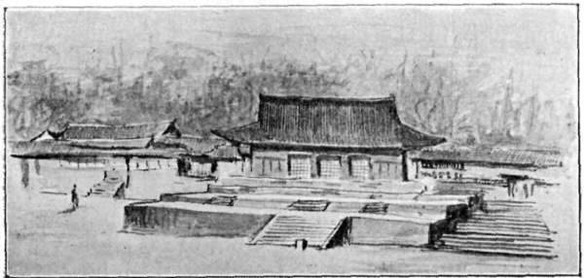 are probably, the best-preserved and most interesting in the neighbourhood of the Corean capital. When I visited them, the monks were extremely polite and showed me everything that was of any note. The temples were in a much better state of preservation than is usual in the land of Cho-sen, and the ornaments, and paintings on the wooden part under the roof were in bright colours, as if they had been only recently restored. There are, near these temples, by the way, tablets put up in memory of different personages. In other respects, they were exactly similar to those I have already described in a previous chapter.
