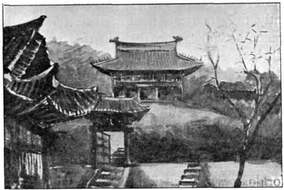 white, blue and yellow. The curled-up roofs are surmounted at each corner with curious representations of lucky emblems, among which the tiger has a leading place.