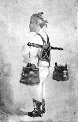 do they cover their faces with white or green hoods, very similar in shape to those worn by the women at Malta. They appear, or pretend to be, shy of men, and foreigners in particular, and generally hide when one is approaching, especially if in a solitary street. I remember how astonished I was the first few days I was in Seoul, at the fact that every woman I came across in the streets was just on the point of opening a door and entering a house. It seemed so strange to me that damsel after damsel whom I met should just be reaching home as I was passing, that I began to think that I was either dreaming, or that every house belonged to every woman in the town. The idea suddenly dawned upon me that it was only a trick on their part to evade being seen, and on further inquiry into the matter from a Corean friend, I discovered that a woman has a right to open and enter any door of a Corean house when she sees a foreign man appearing on the horizon, as the reputation of the masculine "foreign devil" is still far from having reached a high standard of morality in the minds of the gentler sex of Cho-sen. In the main street and big thoroughfares, where at all times there are crowds of people, there is more chance of approaching them without this running away, for in Corea, as elsewhere, great reliance is placed on the saying that there is safety in numbers. So it was mainly here that I made my first studies of the retiring ways and quaint costumes of the Corean damsel.