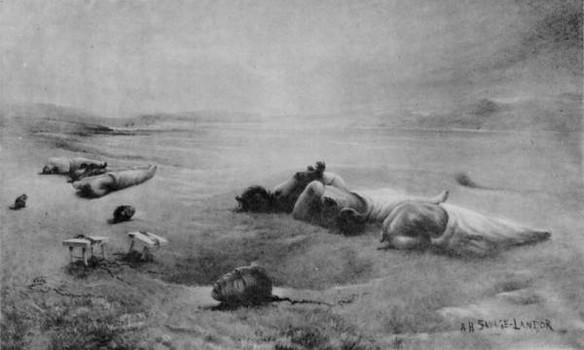 with armfuls of stones, which, as they go up, they throw violently one by one at these imaginary beings, thus showing them that their company is neither required nor wished for, and that they had better keep aloof. If this simple precaution is used, the obliging and scorned spirits seldom interfere with the traveller's welfare. The hills close to the towns are simply covered with heaps of stones, so thrown at these mythical dwellers of the mountains. Such is the effect produced by terror on the people's imagination, that frequently in their imagination they feel the actual touch of the spirits. Probably, if there is any physical touch in those cases, it is only a leaf or a twig falling from a tree. Still, when that occurs a regular fight ensues, the men continuing to fire stones at their imaginary foes, until in their mental vision they see them disappear and fade away in the air. Others not so brave prefer an accelerated retreat, only stopping now and again to throw a stone at the pursuers.