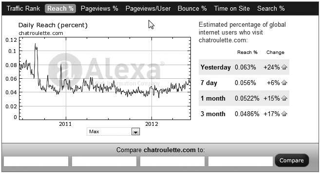 Ложка дегтя. Сайт «Чат-рулетка» выстрелил, но длительное время после его создания Андрей Терновский не предпринимал эффективных действий для динамичного развития проекта. Нет развития – нет роста, что особенно чревато последствиями при появлении большого количества клонов. На диаграмме, которую мы получили благодаря инструментам ресурса http://www.alexa.com, видно, что посещаемость сайта www. chatroulette.com практически в течение всего 2011 г. снижалась (рис. 1.2).