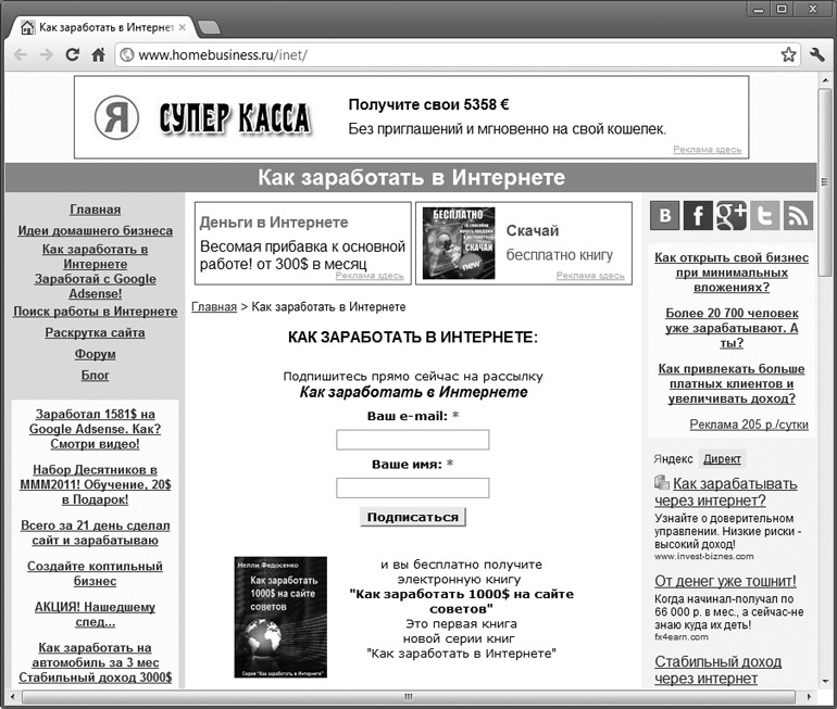 Сайт Нелли Федосенко «Домашний бизнес» размещен по адресу www. homebusiness.ru, а его посещаемость даже в летние месяцы составляет более 6000 посетителей в сутки. Сайт нельзя назвать шедевром веб-дизайна, и он практически под завязку забит различной рекламой (рис. 1.1).