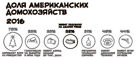 Источники: “Sizeable Gender Differences in Support of Bans on Assault Weapons, Large Clips”, Pew Research Center; ACTA, “The Vote Is In-78 Percent of U.S. Households Will Display Christmas Trees This Season: No Recount Necessary Says American Christmas Tree Association”, ACTA ; “2016 November General Election Turnout Rates”, United States Elections Project; Stoffel, Brian. “The Average American Household’s Income: Where Do You Stand?” The Motley Fool; Green, Emma. “It’s Hard to Go to Church”, The Atlantic; “Twenty Percent of U.S. Households View Landline Telephones as an Important Communication Choice”, The Rand Corporation; Tuttle, Brad. “Amazon Has Upper-Income Americans Wrapped Around Its Finger”, The Time