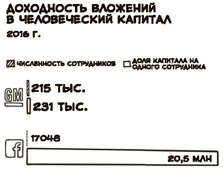 Хотя эти компании и их продукты приносят немалую пользу миллиардам, лишь очень немногие получают от этого экономическую выгоду. Так, в General Motors (делим рыночную капитализацию на численность персонала) на каждого работника приходится примерно 231 тыс. долларов капитала20. Эта цифра поражает, пока не узнаешь, что у Facebook на каждого сотрудника приходится 20,5 млн долларов капитала, то есть почти в сто раз больше, чем у образцовой организации прошлого века21, 22. Для сравнения: это все равно что обеспечение производительности экономики целой страны из Группы десяти[4] населением одного нью-йоркского района.