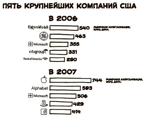 Складывается впечатление, что накопление экономической ценности «Четверкой» не подчиняется закону больших чисел и лишь ускоряется со временем. За четыре года, с апреля 2013-го по апрель 2017-го, стоимость «Четверки» выросла примерно на 1,3 трлн долларов, что сравнимо с ВВП России23, 24.