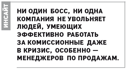В кризисном 2008 году в компаниях едва ли не без разбора увольняли людей, я прекрасно помню этот период! Потом 2014-й – снова кризис в России, массовые увольнения и сокращения. Но я уверен: ни один босс, ни одна компания не уволила людей, умевших эффективно работать за комиссионные, особенно – менеджеров по продажам.