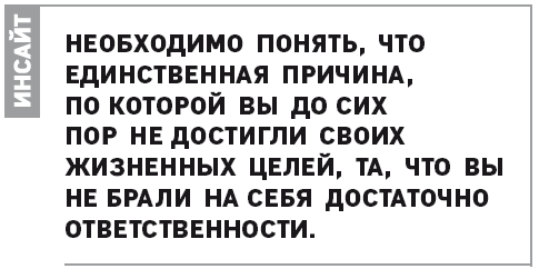Поэтому вам сейчас необходимо понять, что единственная причина, по которой вы в своей жизни до сих пор не достигли целей, которые давным-давно должны были быть закрыты, та, что вы не брали на себя достаточно ответственности.