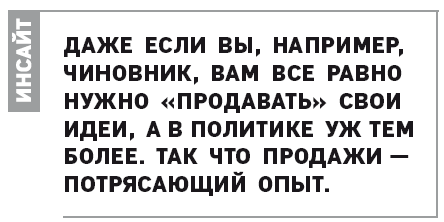Ведь все это, по-моему, нужно в каждой профессии и любой должности. Даже если вы, например, чиновник, вам все равно нужно «продавать» свои идеи, а в политике уж тем более. Так что продажи – потрясающий опыт.