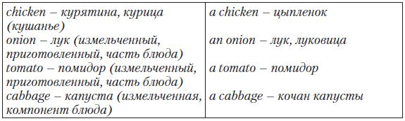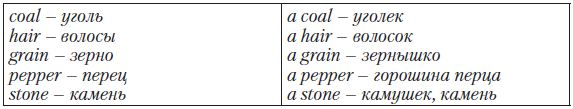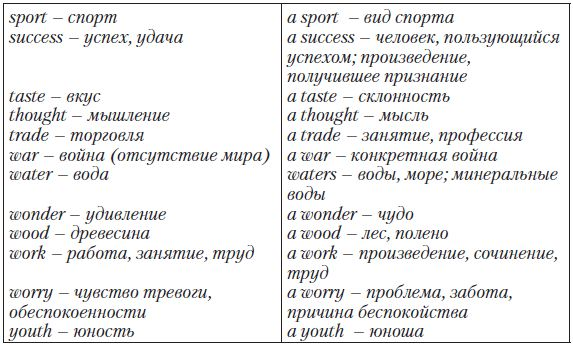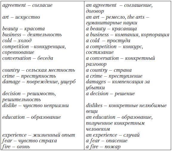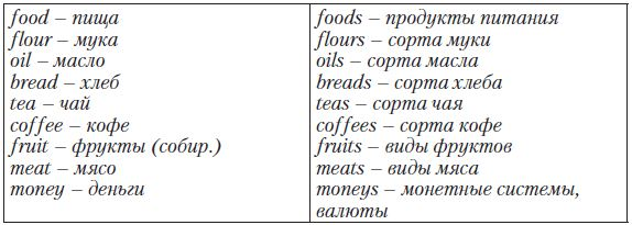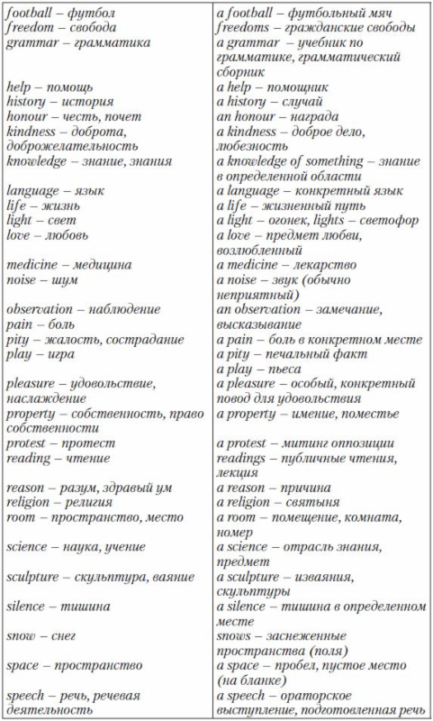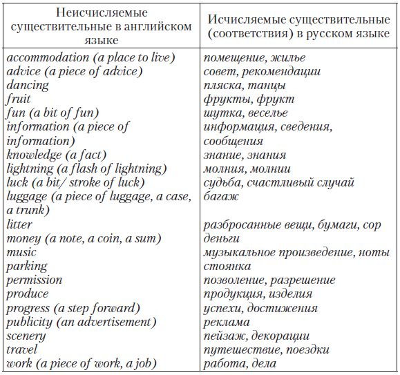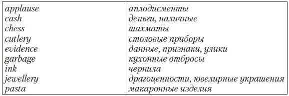Particular Point: Некоторые английские существительные являются неисчисляемыми (не употребляются в форме множественного числа, у них отсутствует неопределенный артикль a/an), в то время как на русский язык они переводятся в форме единственного или множественного числа: