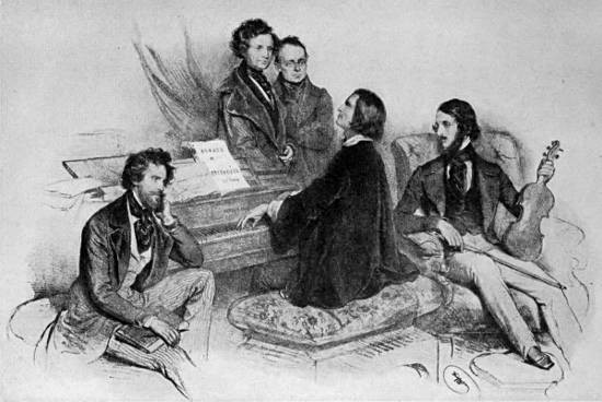 It is a thrice-told tale that several estimable Hungarian magnates raised a purse for the boy, sent him with his father to Vienna, where he studied the piano with the pedagogue Carl Czerny, that indefatigable fabricator of finger-studies, and in theory with Salieri. He was kissed by the aged Beethoven on the forehead—Wotan saluting young Siegfried—though Schindler, ami de Beethoven, as he dubbed himself, denied this significant historical fact. But later Schindler pitched into Liszt for his Beethoven interpretations, hotly swearing that they were the epitome of unmusical taste. The old order changeth, though not old prejudices. Liszt waxed in size, technique, wisdom. Soon he was given up as hopelessly in advance of his teachers. Wherever he appeared they hailed him as a second Hummel, a second Beethoven. And he improvised. That settled his fate. He would surely become a composer. He went to Paris, was known as le petit Litz, and received everywhere. He became the rage, though he was refused admission to the Conservatoire, probably because he displayed too much talent for a boy. He composed an opera, Don Sancho, the score of which has luckily disappeared. Then an event big with consequences was experienced by the youth—he lost his father in 1827. (His mother survived her husband until 1866.) He gave up concert performances as too precarious, and manfully began teaching in Paris. The revolution started his pulse to beating, and he composed a revolutionary symphony. He became a lover of humanity, a socialist, a follower of Saint-Simon, even of the impossible Père Prosper Enfantin. His friend and adviser was Lamenais, whose Paroles d'un Croyant had estranged him from Rome. A wonderful, unhappy man. Liszt read poetry and philosophy, absorbed all the fashionable frenzied formulas and associated with the Romanticists. He met Chopin, and they became as twin brethren. François Mignet, author of A History of the French Revolution, said to the Princess Cristina Belgiojoso of Liszt: "In the brain of this young man reigns great confusion." No wonder. He was playing the piano, composing, teaching, studying the philosophers, and mingling with enthusiastic idealists who burnt their straw before they moulded their bricks. As Francis Hackett wrote of the late Lord Acton, Liszt suffered from "intellectual log-jam." But the current of events soon released him.