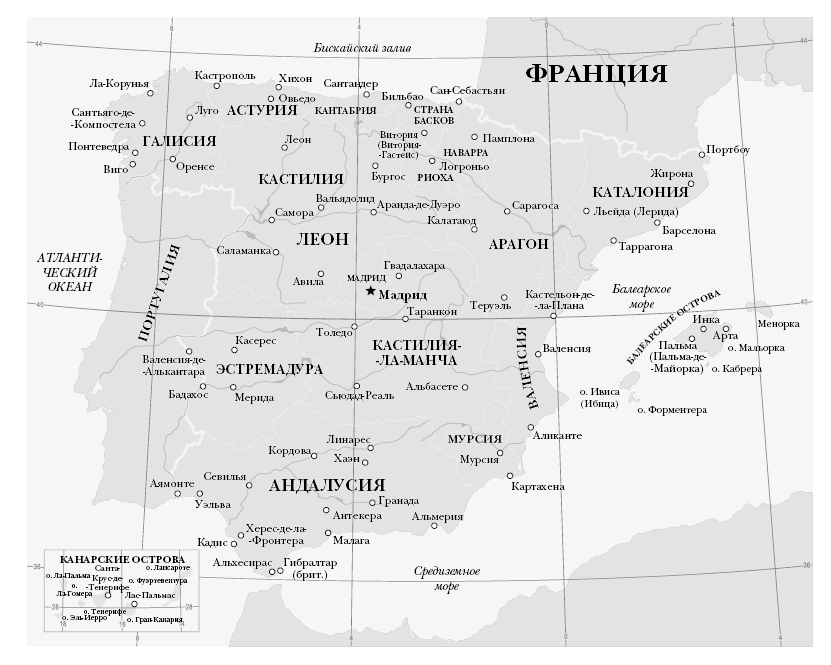 Испания — это не только Пиренейский полуостров. Это еще и острова, Балеарские и Канарские, и анклавы в Марокко — Сеута и Мелилья, эдакий аналог Гибралтара (Гибралтар — территория на юге Испании, которой с 1704 года управляла Британия). Впрочем, власти Испании никогда не считали статусы этих территорий равнозначными. Все остальные владения Испанской империи исчезли, хотя когда-то, если судить по ее размерам и мировому значению, это была величайшая держава в мире.