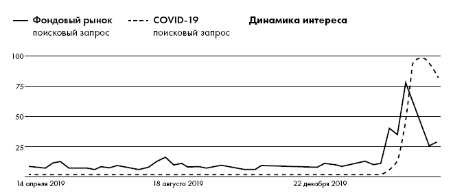 В начале 2020 года, как раз когда я решил написать эту книгу, мировая экономика вступила в очень серьезную рецессию. Я сижу за компьютером и печатаю главу, а тем временем в городах, округах, штатах, провинциях и даже целых странах введен режим локдауна, запрещены все поездки и непервоочередная деятельность. Огромное число людей почти во всех регионах потеряло работу или бизнес, и безработица достигла небывалого уровня. Фондовые рынки в США, Европе, Азии и других частях света упали более чем на 30 %. Обвал фондового рынка стал одной из главных новостей практически на всех информационных каналах и в социальных сетях. С помощью Google Trends я обнаружил весьма любопытную корреляцию между запросами «COVID-19» и «фондовый рынок» (см. рисунок 1.1 ниже).