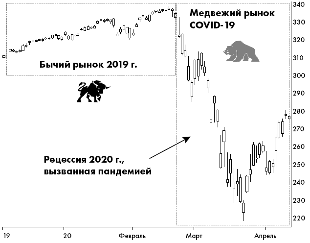 Рисунок 1.2. Сравнение растущего (бычьего) рынка 2019 года и падающего (медвежьего) рынка 2020 года по цене акций 500 крупнейших компаний США. Эти компании отслеживаются индексом S&P 500 и торгуются в биржевом инвестиционном фонде SPDR S&P 500 ETF Trust [тикер – SPY (далее тикер будет помещаться в квадратных скобках после названия компании, – прим. переводчика)]. Для справки: S&P означает Standard & Poor’s, один из индексов, использующихся для отслеживания такой информации.