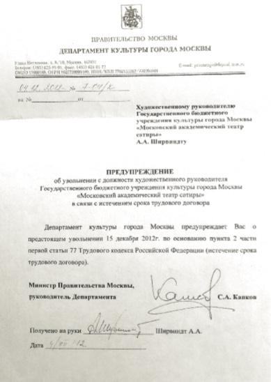 об увольнении с должности художественного руководителя Государственного бюджетного учреждения культуры города Москвы «Московский академический театр сатиры» в связи с истечением срока трудового договора.