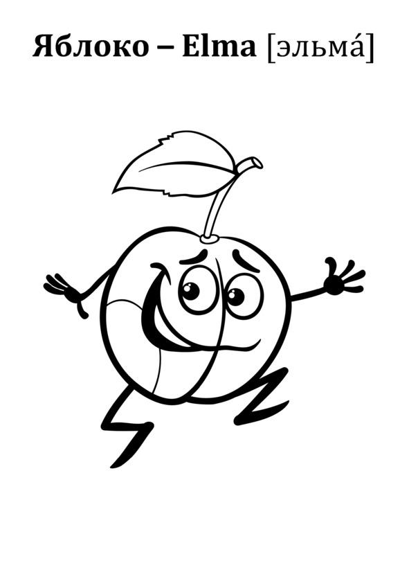 Раскраска состоит из четырех тематических разделов: фрукты, овощи, животные и транспорт.