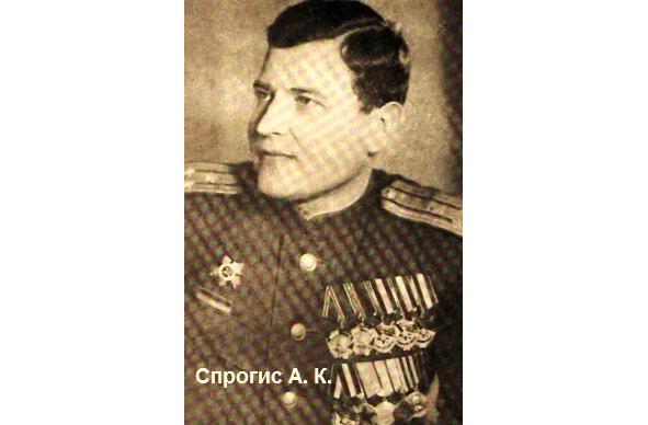 «…Проще, разумнее и удобнее для дела решил этот вопрос начальник 3-го отделения РО штаба фронта майор Спрогис. Старый разведчик, храбрый воин, участник войны в Испании, он не стал мудрить. Зная на опыте, что в военное время самым надёжным и не вызывающим подозрения прикрытием разведчиков могут быть лишь воинские части, он занял свободные казармы, с удобством расположил там все своё хозяйство и личный состав, создав прекрасный учебный центр, откуда вышло много славных героев — патриотов разведчиков и партизан…»[4]