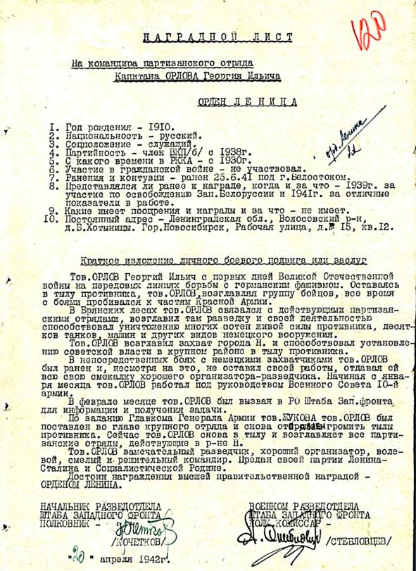 Немало фронтовых разведчиков, на завершающем этапе Отечественной войны, оказавшиеся на задании в тылу противника в Восточной Пруссии, начинали свой боевой путь в отряде Особого Назначения Западного фронта, которым командовал Орлова Георгий Ильич. Послужной список этого офицера — боевой путь настоящего разведчика. Скупые строки в наградных листах лучшим образом подтвердят сказанное.