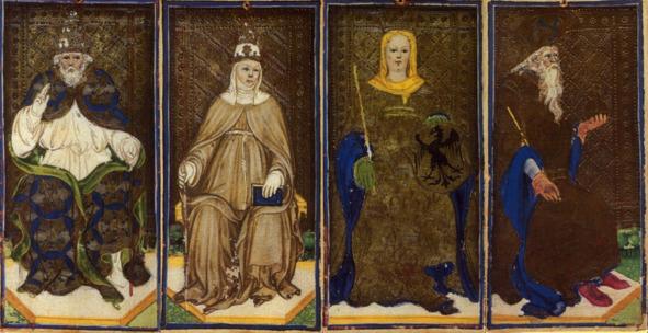 Если рассмотреть рисунки и названия первых пяти карт: маг — жрица — царица — царь — жрец, то хочется выделить последние четыре в группу. Но неудобно начинать группу со второй карты. Появляется проблема, которая усугубляется в связи с именованием пятой карты: Иерофант, Жрец, Папа, Квинтэссенция. Квинтэссенция не может быть частью четырехчастной структуры: «четверицы» (введенной Пифагором) или «кватерниона» (по К. Г. Юнгу). Обратим внимание, что Маг и Жрец частично дублируют друг друга. Маг, отчасти, — молодая, деятельная ипостась Жреца. В ипостасях Жонглера и Скомороха он обладает большей свободой, чем Жрец.[7] Можно предположить, что нумерация этих двух карт была перепутана или неправильно восстановлена в XV веке, и квинтэссенцией (пятой картой) являлась или карта Скоморох-Жонглер-Маг, или другая карта. Отметим, что в коллекции «Висконти-Сфорца» есть карты, не получившие идентификации при принятой нумерации.