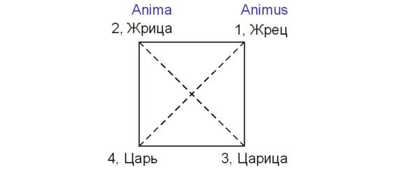 Нумерация слева направо была принята в еврейских и арабских эзотерических построениях, и мы используем ее для первой группы. Карты 3 и 4 образуют «царскую» пару, а весь квадрат — брачный кватернион, хорошо известный в аналитической психологии К. Г. Юнга.[8] При этом карта 1 символизирует Animus королевы, а карта 2 — Anima короля. По сути, это первый кватернион, который рассматривает Юнг в своей теории человеческой самости.[9] Anima, как женское начало, существует в каждом мужчине, а animus, как мужское, — в женщине. При образовании брачной пары эти две структуры взаимодействуют между собой. Царь вступает отношения с Царицей через свою Аниму (душу), а Царица, в свою очередь, — через свой Анимус (ум, дух). Эти, частично опосредованные, отношения на рисунке изображены пунктирными диагоналями. В царской паре anima и animus приобретают частичную персонификацию в волшебных образах Жреца и Жрицы. Одновременно с этим 1 — небесная мудрость, а 2 — земная душевность, т.е. первичные символы мужского и женского начала в природе. Представление первых четырех карт в виде единого брачного царского кватерниона объясняет положение на третьей карте царицы, а не более ожидаемого царя (нечетное число, более логичное чередование — М, Ж, М, Ж. Буквы М и Ж обозначают пол.). Поскольку в брачном кватернионе каждая вершина соединяется сторонами квадрата только с противоположным полом (Царь с Царицей и Жрицей (Anima царя)), то, при выборе построения квадрата по строкам, это и могло определить положение на третьей карте именно царицы. Этот кватернион является небесной презентацией родительского комплекса, сокрытого в каждом путешествующем по жизни «Шуте».