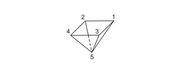 В брачном кватернионе число реальных персон равно двум, и следующая карта (с номером 5) — рождающееся от их сочетания. Кто это? С некоторой очевидностью, это не может быть Жрец. Несмотря на его мудрость, он слишком определен в своей роли для рожденного и стар. Иерофант — верховный жрец в Элевсинских мистериях Деметры, и рядом с ним всегда была Жрица-Иерофантида. Та, которая изображена на второй карте, что опять же толкает нас сблизить их в последовательности карт. Если родившийся и мудр, то как дитя, как «внутренний человек», как HOMO LUDENS (человек играющий). Ему и предстоит сыграть, выйдя на подмостки жизни. Он — внутреннее Я «Шута», его молчаливый спутник. Это поддерживает произведенную нами замену местами первой и пятой карты, Скоморох — источник Шута и одновременно его отражение в глубине души, на внутреннем зерцале. Он — квинтэссенция существования первых четырех, что отразилось в самом названии пятой карты.[10] В этом варианте названия раскрывается ее смысл, как пятой эссенции [из четырех]. Поэтому, вполне логично будет изобразить ее, как выходящую за пределы плоскости первых четырех фигур, и имеющую связь со всеми ими. Назовем эту квинтэссенцию — «просвещенное дитя», подчеркивая тем, что он плод брачного царского кватерниона, и наделен внутренним знанием. В результате получается опрокинутая пирамида (рис. 3). Она представляет первую целостную структуру, содержащую свое порождение (квинтэссенцию). Отметим, что на место этой карты может претендовать не только Маг, но и ранее не идентифицированная карта из колоды Висконти-Сфорца.