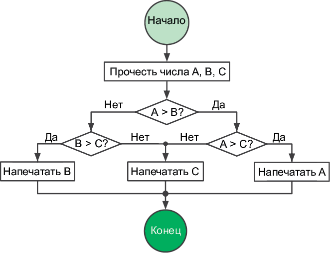 Рассмотрим составление блок-схемы на примере задачи поиска наибольшего из трех чисел (рис. 1.2).