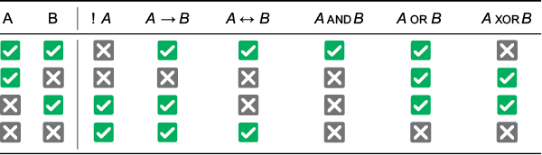 Они либо истинны (true), либо ложны (false)8. A = True обозначает теплую воду в бассейне, B = False обозначает «Я не плаваю». Переменная B не может быть наполовину истинной, потому что я не способен плавать лишь отчасти. Зависимость между переменными обозначается символом