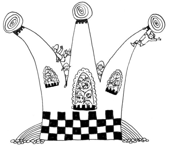 Зелёным балконом называлась площадка на самом-самом верху Замка, откуда было видно все шахматное Поле, и даже немножко дворец чёрных фигур. Балкон ограничивался резными перилами, заросшими чем-то вьющимся вроде нашего вьюнка, только цветы-юбочки у него не белые с розовым, а нежно-зелёные. Зелёный балкон мог вместить около тридцати зрителей, а желающих бывало всегда куда больше, поэтому младшим пешкам не часто выпадала удача поглядеть на сражение.