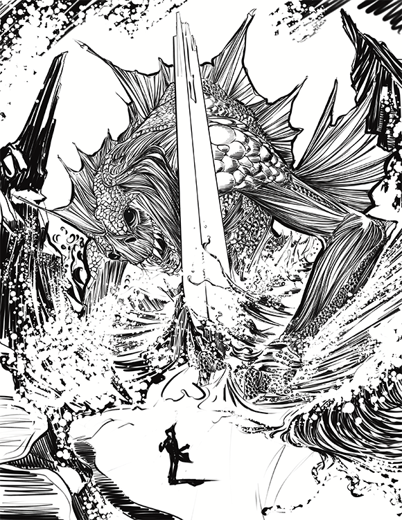 Dazed and frightened, yet not without a certain thrill of the scientist’s or archaeologist’s delight, I examined my surroundings more closely. The moon, now near the zenith, shone weirdly and vividly above the towering steeps that hemmed in the chasm, and revealed the fact that a far-flung body of water flowed at the bottom, winding out of sight in both directions, and almost lapping my feet as I stood on the slope. Across the chasm, the wavelets washed the base of the Cyclopean monolith; on whose surface I could now trace both inscriptions and crude sculptures. The writing was in a system of hieroglyphics unknown to me, and unlike anything I had ever seen in books; consisting for the most part of conventionalised aquatic symbols such as fishes, eels, octopi, crustaceans, molluscs, whales, and the like. Several characters obviously represented marine things which are unknown to the modern world, but whose decomposing forms I had observed on the ocean-risen plain.