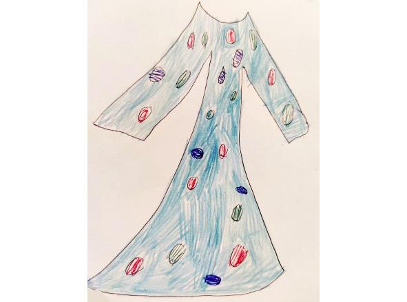 И вот остановилась она возле нарядного голубого, серебром и парчой расшитого платья, с драгоценными украшениями. Руки сами потянулись примерить, одела — как влитое платье село, будто на неё шитое. Украшения мерцают, светятся, парча переливается, не платье — загляденье. И туфельки под стать наряду сыскались, как раз впору пришлись.