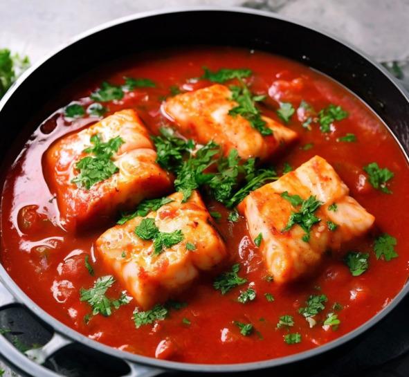Если вы хотите более острое блюдо, добавьте красный перец. Положите нарезанные куски рыбы в сковороду и дайте им вариться в томатном соусе на среднем огне около 5—7 минут, или до тех пор, пока рыба не станет нежной и приготовится.