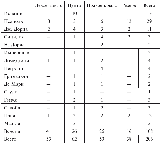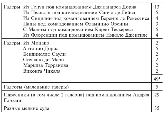 Рассказы о силе и составе христианского флота отличаются друг от друга, но все авторы считают, что в нем было 200–210 галер, не считая 6 венецианских галеасов. Современные событиям описания боевых порядков были перепечатаны некоторыми более поздними авторами, такими как Роселл, де ла Гравьер и Нани. А рассказ самого Веньеро о его команде, опубликованный Мольменти, включает более или менее независимый список, который в целом согласуется с другими. Подробное описание различий в описаниях представляется утомительным и ненужным, учитывая их общую согласованность. Следующая таблица, вероятнее всего, очень близка к истине17.