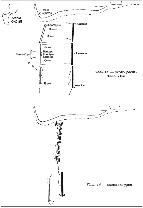 На самом деле Дон Хуан покинул Барселону в тот же самый день, когда Колонна добрался до Мессины, и после долгих задержек в Генуе и Неаполе не появился на месте встречи до 23 августа. Но даже тогда с ним была лишь небольшая часть его сил16, поскольку основная часть испанско-итальянской эскадры все еще грузила войска и припасы в портах Северной Италии. Венецианцы тоже ждали прибытия галер с Крита. Те подошли 1 сентября, за ними 2-го подоспел Дориа с 11 галерами, а 5-го – Санта-Крус с неаполитанскими кораблями. Теперь собрались все.