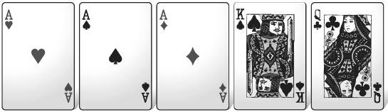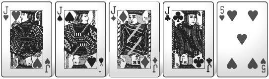 Любые четыре карты одинакового ранга и неопределенная пятая карта. Чем выше достоинство карт, тем сильнее комбинация. Если у двух игроков равные по достоинству каре, в игру вступает более старшая пятая карта. Но эта ситуация возникает при игре с несколькими колодами карт.