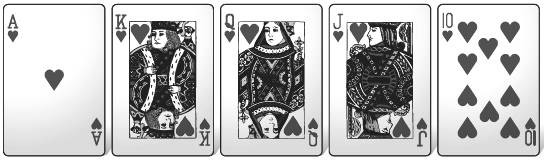 Последовательность старших карт одной масти: туз (А), король (К), дама (Q), валет (J), 10. Старшими в покере считаются карты от десятки до туза. В данном случае все масти равнозначны. Банк распределяется поровну между одинаковыми комбинациями, невзирая на масть. Это самая высшая покерная комбинация, которая бьет все остальные. Собрать такую руку считается большой удачей.