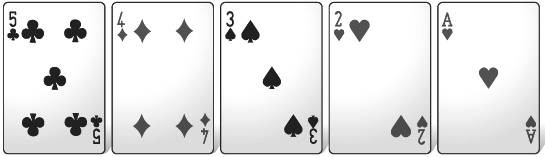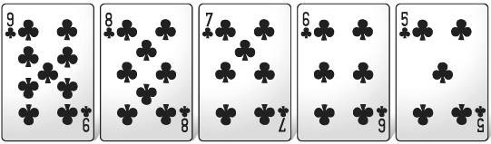 Последовательность карт одной масти. Туз может быть частью стрит-флеша, если он расположен в конце (5, 4, 3, 2, А). Комбинация вида 8, 7, 6, А, К не будет стрит-флешем, так как нарушена последовательность карт. При сравнении нескольких стрит-флешей выигрывает тот, в котором старшая карта выше по рангу.