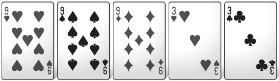Любые три карты одинакового ранга и пара двух других карт. Например, комбинация из трех тузов и двух королей будет выше, чем три короля и два туза. Старшинство фул-хаусов определяется по рангу карт, входящих в тройки. В некоторых разновидностях покера, где играют с использованием нескольких колод, при совпадении достоинств в тройке лучшая комбинация определяется по двойкам.