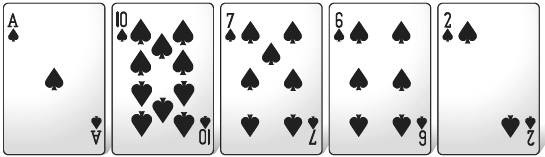 Комбинация из пяти карт одной масти в любой последовательности. Ценность комбинации определяет самая высокая по рангу карта. В приведенном примере – флеш с туза. При совпадении всех карт банк делится поровну, так как масти равны между собой.