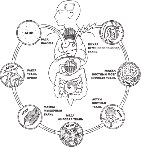 Когда процесс переваривания пищи подошёл к концу, из питательного хилуса начинается формирование тканей организма. Согласно Аюрведе, человеческий организм состоит из семи Дхату (тканей).