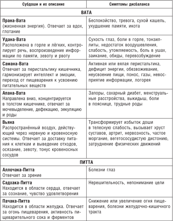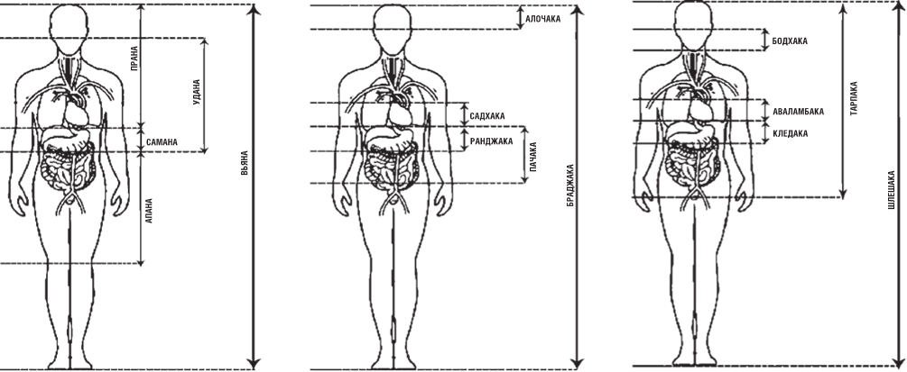 Вата-доша локализуется в теле ниже пупка, включая ноги, Питта – от пупка до груди, Капха – от груди и выше. И у каждой доши есть свои центры, или «дома»: у Ваты – толстый кишечник, Питты – тонкий кишечник и желудок, дом Капхи – лёгкие. Когда доши накапливаются в своих домах без меры, начинается их дисбаланс и они «выходят за границы своих домов». Тут-то и начинаются болячки.