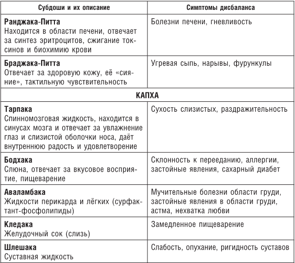 Капха отвечает за все ткани в целом, поскольку она является основной субстанцией организма, а в особенности – за пять Дхату: плазму, мышцы, жир, костный мозг и репродуктивную ткань. Питта порождает кровь, пот, а Вата – кости.