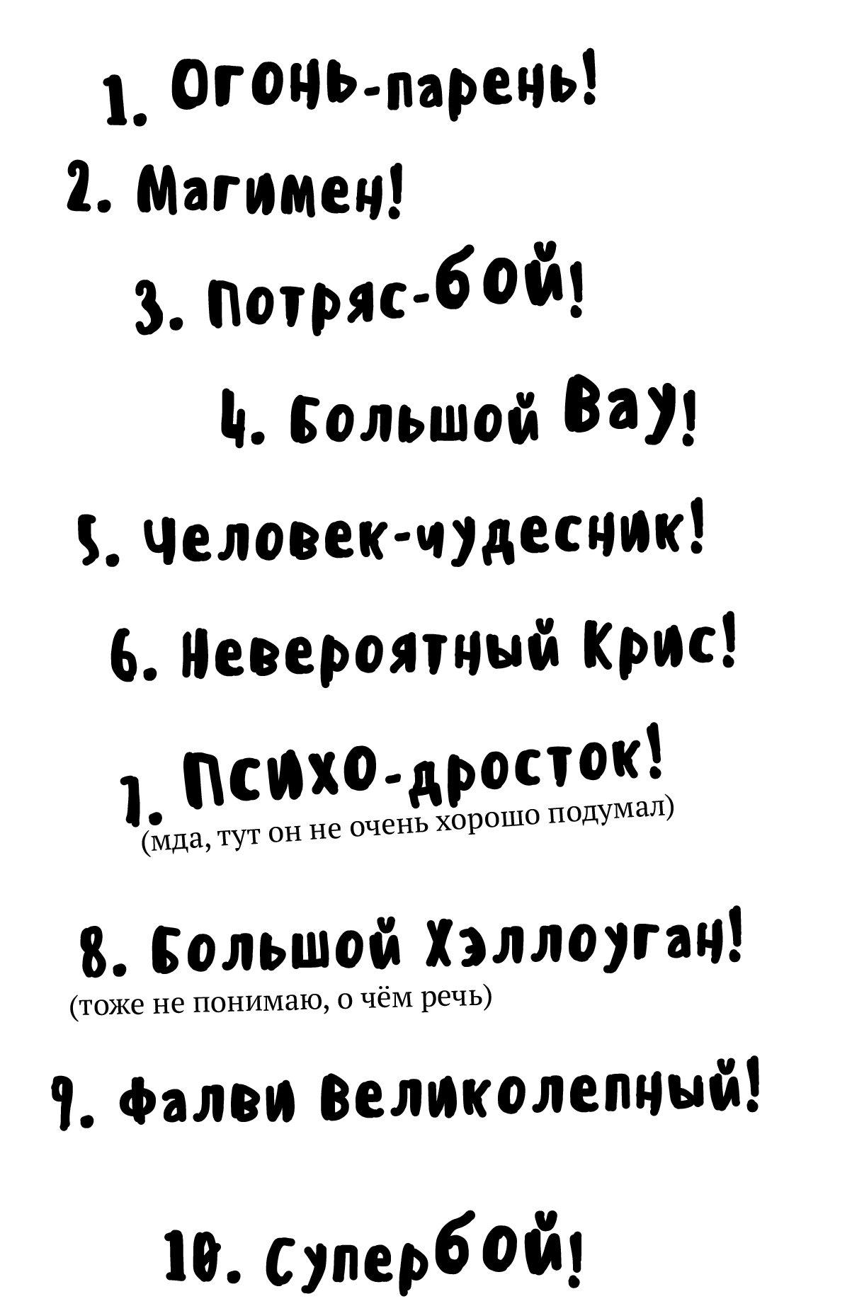 Роза прибегала к магии, чтобы помогать раненым ежам, а Крис прибегал к магии, чтобы привлекать к себе всеобщее внимание! Он любил выставляться. Он выпускал из пальцев молнии и использовал заклинание полёта, чтобы покрасоваться перед девушками в торговом центре. Он становился невидимым, чтобы бесплатно проходить на футбольные матчи и концерты. Он даже начал носить костюм супергероя и составил себе список подходящих имён.