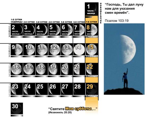 «…И сказал Господь Моисею и Аарону в земле Египетской, говоря: месяц сей да будет у вас началом месяцев, первым да будет он у вас между месяцами года. (Исх.12:1—2) Некоторые предполагают, что Земля была сотворена в 7-м месяце. Хорошо, пусть думают, молодцы. В общем с тех пор, как первый человек увидел ту фазу луны в 6-е сутки первой седмицы (недели), ничего принципиально не поменялось. Всякий 6-й день первой седмицы Адам и Ева, и их дети тоже видели луну по-прежнему показывающую светящуюся половинку, что соответствует 7-му числу месяца, но, при этом соответствует 6-м суткам (первой седмицы). Посмотри на иллюстрацию. Все 7-е числа месяцев автоматически говорят о 6-х сутках первой недели. 7-е, 14-е, 21-е, 28-е. Все эти числа месяцев находятся только в 6-м дне недели (седмицы). А 8-е, 15-е, 22-е и 29-е в 7-м дне недели и т. д. Потому что важно брать во внимание тот самый библейский день новомесячие, 1-е число, не входящее в последующее за ним 6 рабочих дней (суток). За шестью рабочими днями труда наступает выходной 7-й день, суббота. Субботы созданы людям, как освященные, специальные дни для счастья, для остановки дел и общения с Творцом и своими близкими. А день новомесячие, эти сутки всегда соответствуют первому числу любого месяца в году. Тому подтверждение множество Библейских текстов и в Ветхом, и в Новом заветах. Выбрось на некоторое время из головы вавилонские шаблоны с четырьмя семерками без новомесячий. Расслабься. Не будь трусливым паникёром, эта информация сделает тебя счастливее. Дальше поймёшь, почему большинство реформаторов не докопались до этой истины и соблюдали пятницу, субботу и воскресенье в сетке Всемирного календаря, при разработке которого из него были вырваны дни новомесячия. Что Е. Уайт говорила по этому поводу. По какому календарю была высчитана дата 22 октября 1844 года, день, на котором основана одна из самых духовно богатых религиозных организаций этого мира. В конце книги подняты архивы о том, когда и почему христианские лидеры рассматривали эту истину и отказались от неё. От внимательного рассмотрения темы у тебя же не отнимут твой любимый календарь, который, согласись, и так не нуждается в защите. Вероятно, ты ещё не понял, или не в курсе, или не наблюдал, не считал и не заметил, что каждое 14-е число любого месяца (библейского) Луна по-прежнему показывает полнолуние. В это число всегда наступает день приготовления к субботнему покою Господу. Что 14-е число соответствует 6-му дню второй седмицы. Если захочешь, то и тебе покажу, где и сколько раз в Библии написано, что именно 14-го числа первого месяца года, весной Бог вывел народ из Египта, в день приготовления к субботе. А попробуй поищи в григорианском календаре такой расклад, чтобы 14-е число подряд каждый месяц попадало бы на пятницу. Забудь, больше ни в каких календарях так не работает. Сомневающиеся называют это лишь версией. Надеюсь, что чуть дальше ты по любому убедишься, что выход из Египта произошёл красиво и чётко по Божьему расписанию, словно для рекламы спасительных 10 заповедей, а не в угоду гнева смертного человека с названием фараон. А через несколько веков, в нашу эру Христа распяли 14-го числа этого же первого месяца в Иерусалиме. Как написано это был день перед субботой, а после 14-го числа, разумеется, число 15-е. В Библии суббота в центре всякого месяца не бывает вне 15-го числа. Все центральные 
