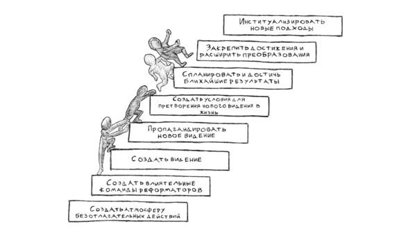 Любые большие изменения требуют нескольких последовательных шагов. Что бы вы не хотели внедрить — новую систему мотивации и показателей эффективности сотрудников, CRM для отдела продаж, выпуск на рынок нового продукта — все это займет не один день и потребует вовлечения большого количества людей. Итак, Коттер полагает, что стоит сделать следующее: